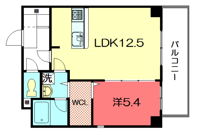 - 洋室5.4帖、LDK12.5帖