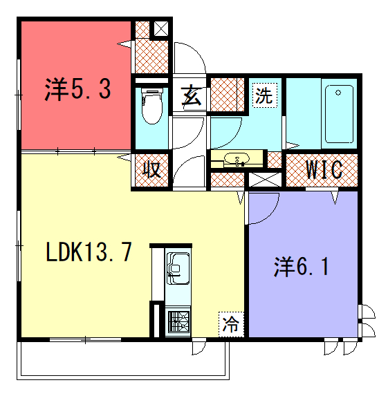 - LDK13.7帖、洋室6.1帖、洋室5.3帖