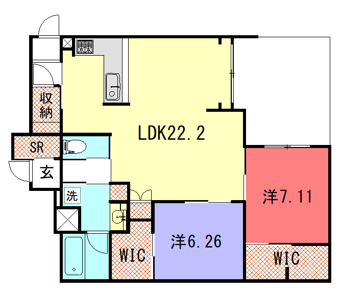 - LDK22.2帖、洋室7.11帖、洋室6.26帖